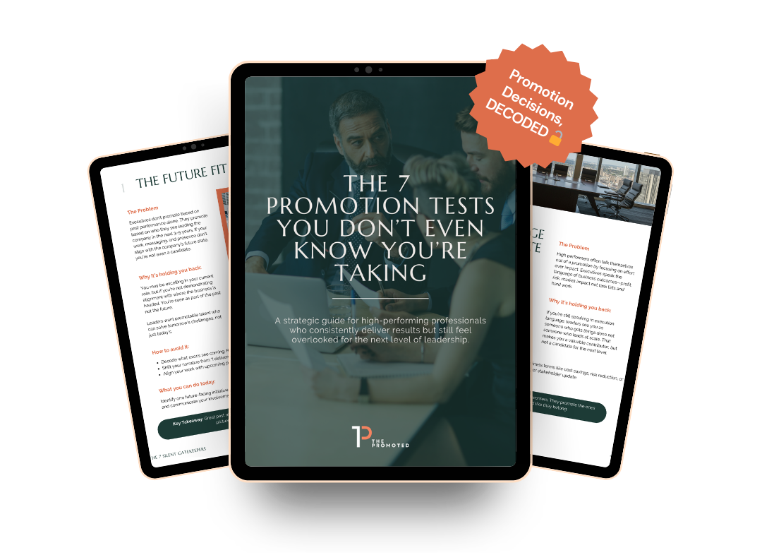 I created The 7 Promotion Tests Guide to make those hidden dynamics visible. This guide translates what actually gets discussed in promotion conversations, so you can stop guessing, understand what’s really holding you back, and navigate the next level with clarity and intention.